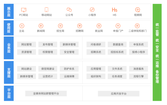 Ø 打造与网站群双核驱动的动态应用统一建设管理平台:通过统一技术和规范,标准化接口等方式打造基础平台。前端与网站群无缝集成,继承沿用网站群积累沉淀的安全经验,保障平台的安全和稳定。