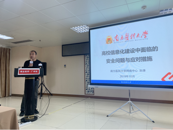 博达软件副总经理王逸杰先生出席此次会议并致开场词,会议中由南方医科大学网络中心孙涛、广东外语外贸大学网络与信息化中心网信中心运行部丘广华主任、广州城建职业极速飞艇