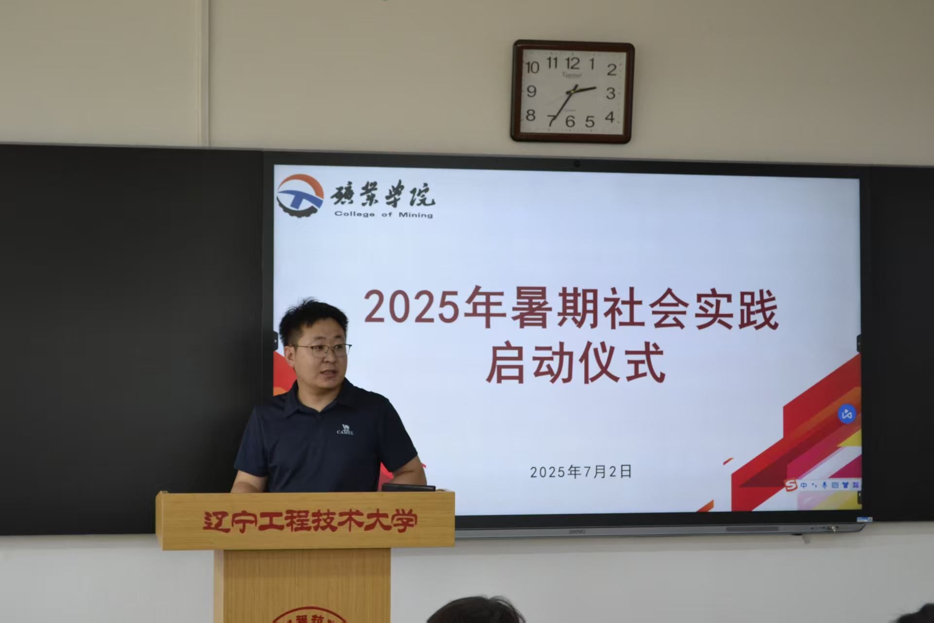 仪式上,蒋来老师首先宣读了 2025 年暑期社会实践校级及院级重点团队名单,明确各团队实践方向与任务。结合2025年实践部署,他对全体参与同学提出三点要求:一是以学铸魂,淬炼信仰根基。深入基层群众,感悟思想伟力,将“小我”融入“大我”,把青春写在祖国大地上。二是以践强能,锻造硬核本领。在乡村振兴一线“自找苦吃”,运用专业知识解决实际问题,做到学用结合、知行合一。三是以创增效,扩大实践声量。形成可推广的调研成果,通过新媒体讲好青春故事,提升影响力。