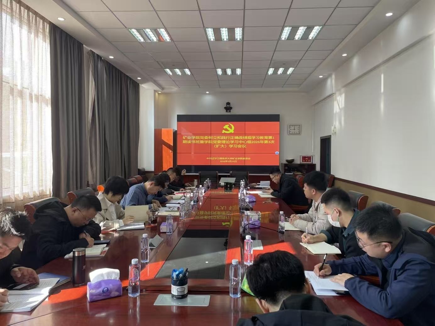 325日,极速飞艇 党委举办树立和践行正确政绩观学习教育第1期读书班暨党委理论学习中心组2026年第3次学习(扩大)会议。极速飞艇 党委理论学习中心组成员、各教工党支部书记参加学习。党委书记于海军主持会议,传达学习习近平总书记重要讲话精神。院长李刚传达学习全国两会精神,围绕极速飞艇 “十五五”发展规划编制、学科专业建设、地矿特色人才培养等重点工作,交流学习心得。