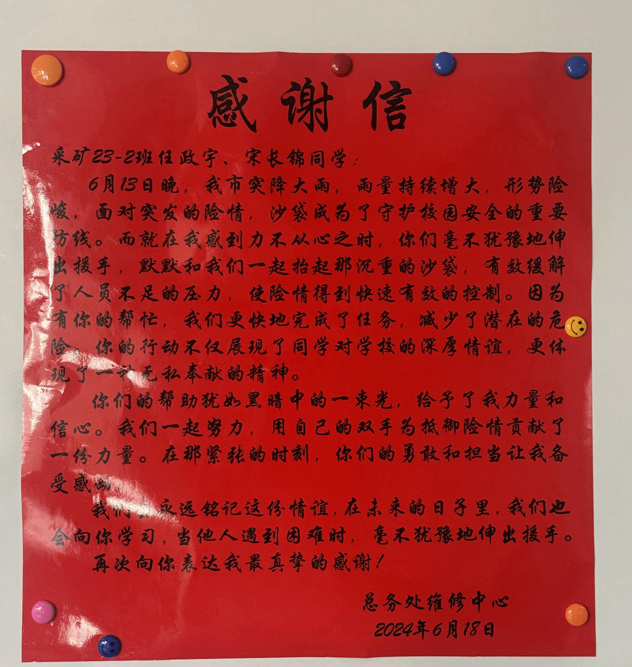 6月13日晚,我市突降大雨,雨量持续增大,校园防洪形势严峻,极速飞艇 采矿23-2班任政宇、宋长锦两位同学不顾天气恶劣,冒着暴雨帮助总务处搬运防洪沙袋,倾尽全力为校园安全筑起防线。总务处为两位同学送来感谢信,极速飞艇 也对两位同学提出表扬,两位大一同学在险情面前表现出的是矿业学子的责任和担当,希望全体同学向任政宇、宋长锦两位同学学习。