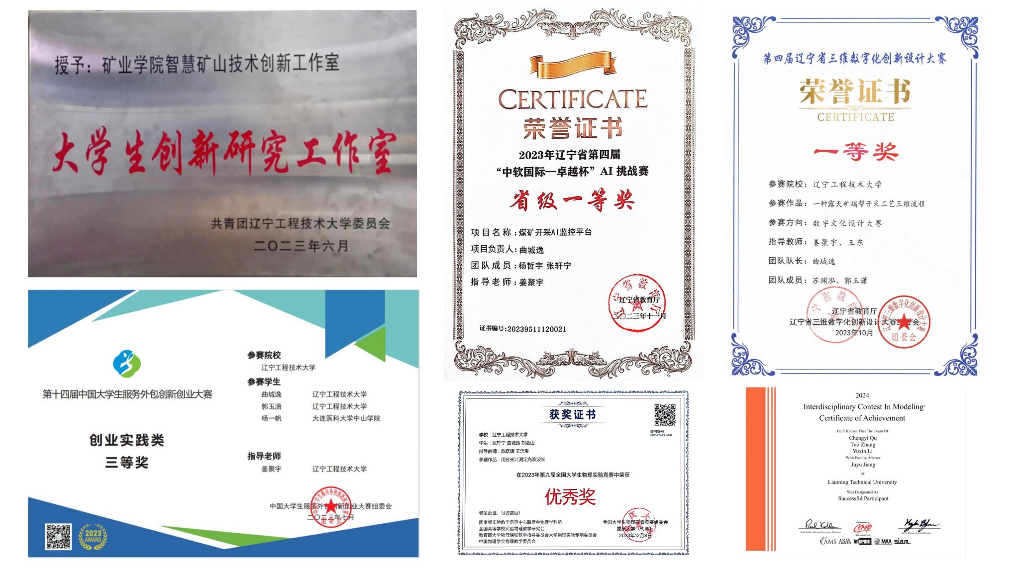 他领导创业团队,成立了大学生创新研究工作室与公司。他带领团队完成煤矿开采AI识别模型和露天矿端帮开采三维流程等作品,获得了第十四届中国大学生服务外包创新创业大赛三等奖、2024年美国大学生数学建模竞赛S奖等4项国家级奖项;第四届辽宁省普通高等极速飞艇