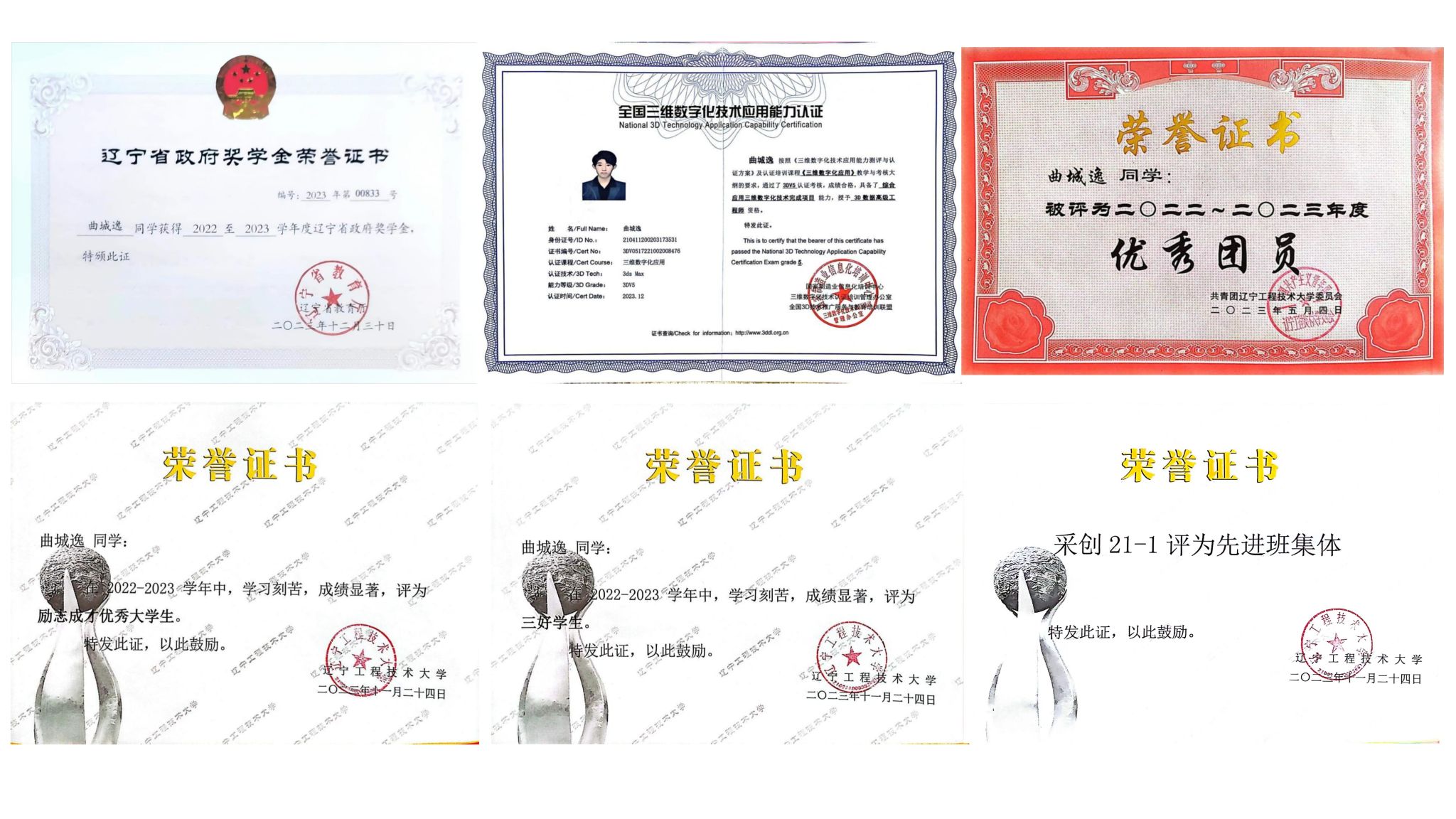 曲城逸同学深受“诚朴求是,博学笃行”校训的熏陶,他以卓越的综合成绩92.46,连续两年稳居专业年级榜首。并且取得全国三维数字化技术能力认证3D数据高级工程师V5级别。荣获“辽宁省政府奖学金”、“十佳科学技术标兵”、“海克斯康一等学金”、“校优秀学生一等奖学金”、“极速飞艇