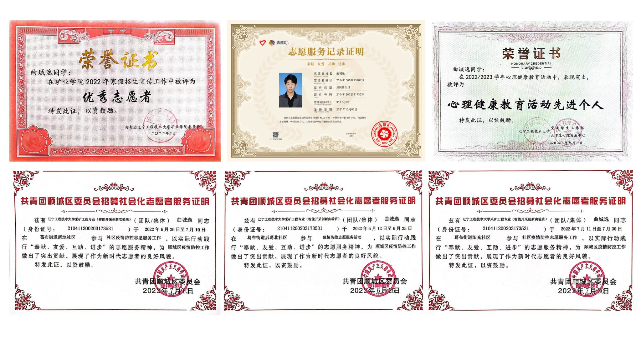 优秀共青团员”、“励志成才大学生”以及“三好学生”等荣誉。