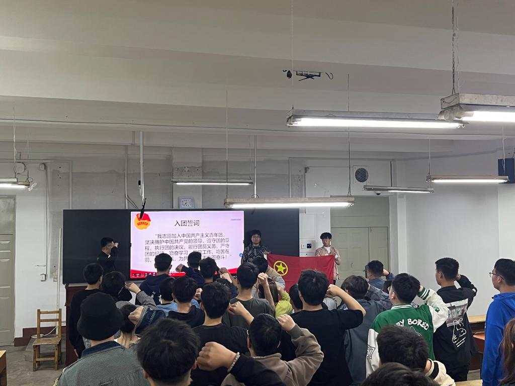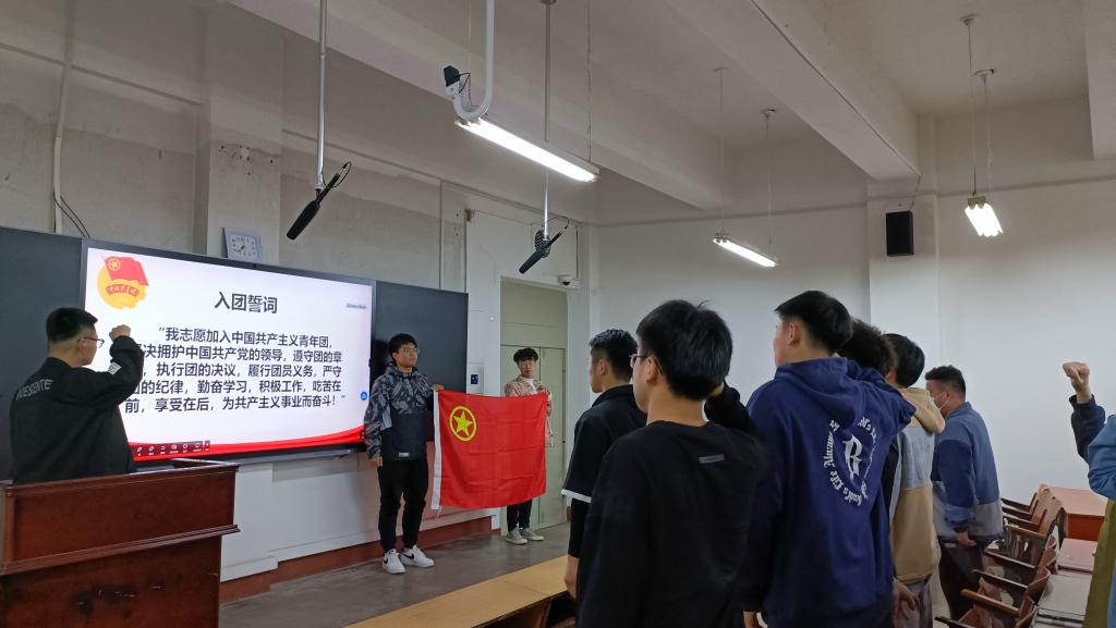 随后,全体同学通过观看2022年“最美大学生”发布仪式视频学习“最美大学生”的先进事迹和学习生活感悟,进一步认识到青年要志存高远、脚踏实地,不畏艰难险阻,勇担时代使命。最后,全体同学面向团旗重温入团誓词,铿锵有力的誓言增强了每一名团员的荣誉感、使命感。