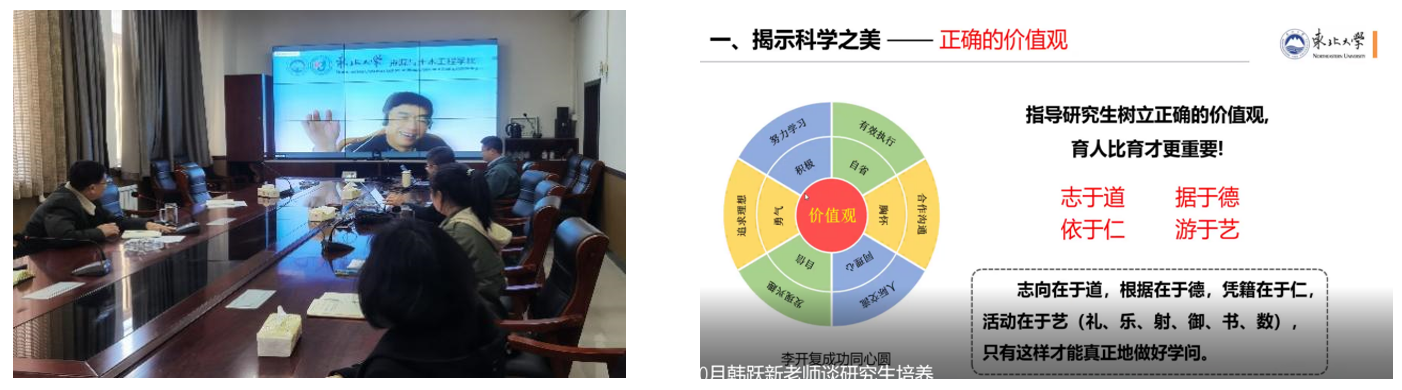 韩跃新院长以《揭示科学之美,感受研究之乐》为主题,传授导师指导研究生应树立正确的价值观,要热爱自己的专业,强调导师的责任和义务,发挥导师团队的作用,为研究生搭建科研平台,培养研究生具有家国情怀。