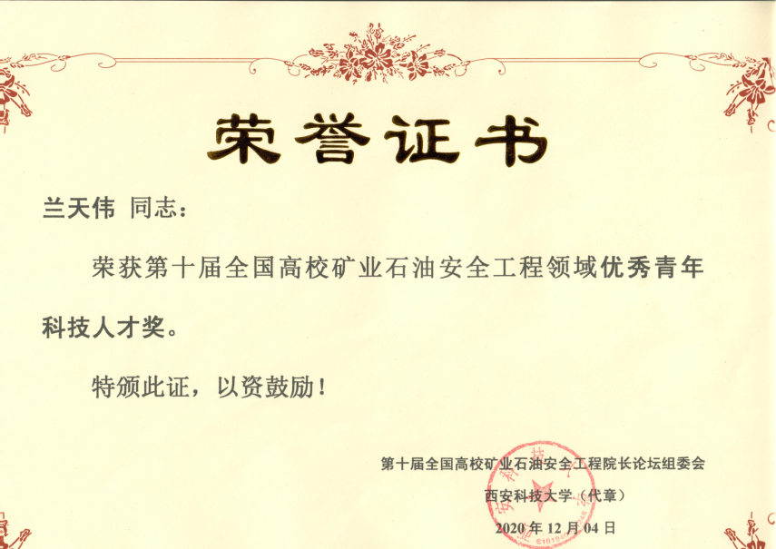 青年教师兰天伟教授,获全国矿业石油安全领域优秀青年科技人才奖。