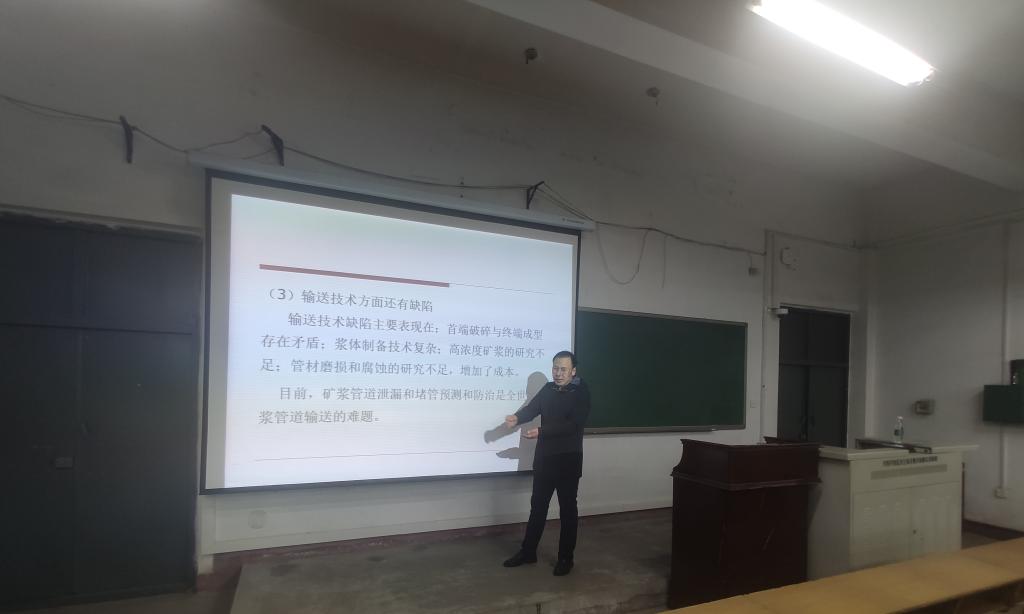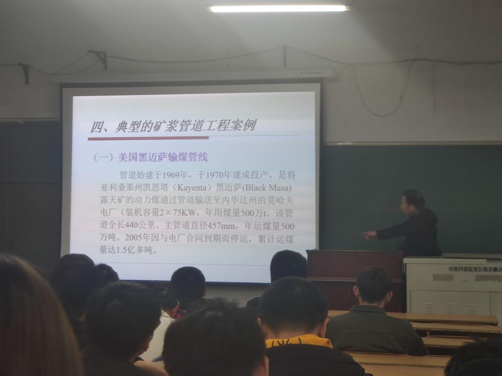 首先赵利安老师介绍了国内外矿浆管道输送发展状况,并指出我国在这方面研究虽然起步较晚但却也取得了不错的成绩,目前,我国矿浆管道输送涉及多个工业领域,其应用范围扩展到铁矿,铜矿,金矿等10余品种。同时,赵老师通过对管道运输和公路,铁路运输的直观比较,形象的展示了管道输送的优势,并通过3D动画具体的刻画,使同学们清楚的认识到我国在此领域的实力。随后,赵老师着重向同学们介绍了矿浆管道输送系统的构成,指出该系统由前处理(制浆)系统、管道输送系统、后处理(脱水、烘干)系统组合而成,结合系统运作相关图片,方便同学们深入的了解。最后,赵老师为同学们介绍了世界上在此领域上比较典型的矿浆管道工程案例,并与同学们交流关于我国矿浆管道输送技术的挑战与前景展望,概括出我国在该领域存在的三大缺陷。