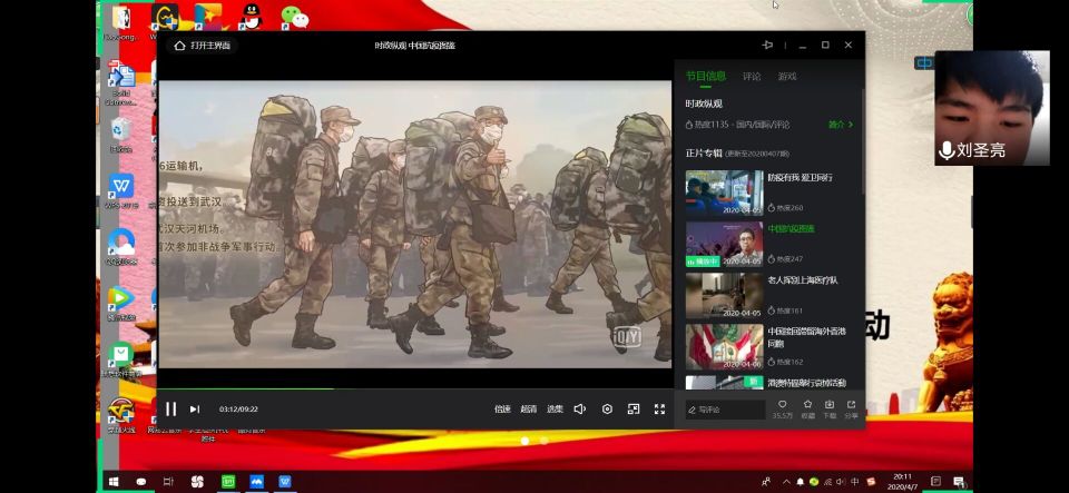 各班采用腾讯会议等软件组织线上会议,播放“中国抗疫图鉴”视频,全体同学共同观看。通过其中钟南山逆行、八方驰援、火神山雷神山医院拔地而起、各地医疗队出征、全国人民居家防护等画面,学生被抗疫英雄无私奉献、英勇无畏的精神感染,同时再次深刻认识到,疫情发生以来,正是在党中央的英明领导下,发挥中国特色社会主义制度优势,全国上下团结一心、众志成城,我们方能共同打赢这场疫情防控阻击战。